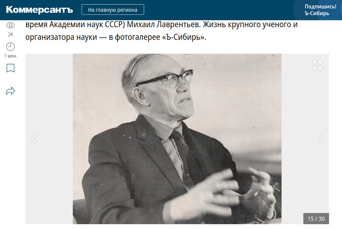 Научные сотрудники Института истории СО РАН и популяризация науки. Сотрудники Института истории СО РАН приняли участие в подготовке материалов, посвященных 125-летию со дня рождения академика М.А. Лаврентьева для газеты «Коммерсантъ»