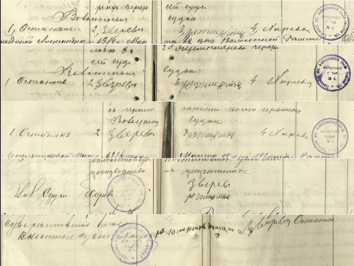На представленной к докладу иллюстрации − сопоставление подписей и печатей под решениями волостных судов проливает свет на то, что оставалось за кадром: механизм работы волостного суда, включающий особую роль председателя судейской коллегии.