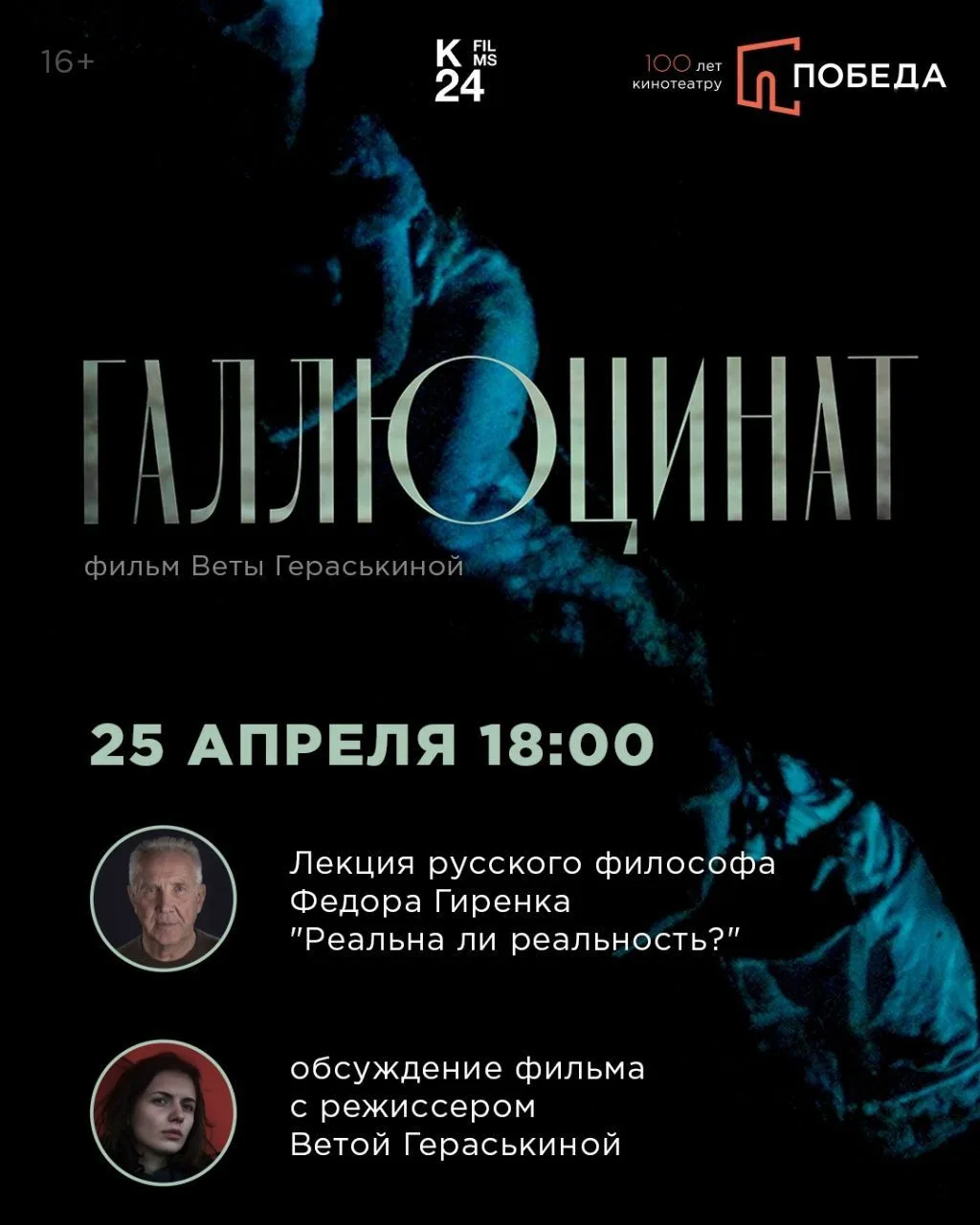 25 апреля в кинотеатре «Победа» покажут один из самых загадочных фильмов последних лет — «Галлюцинат». Мистическую картину обсудит со зрителями режиссер Вета Гераськина, а перед показом состоится лекция русского философа, основателя Московской антропологической школы Федора Гиренка «Реальна ли реальность?» — именно его идеи лежат в основе этого фильма.